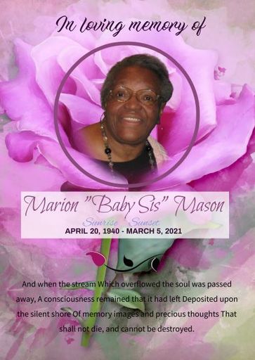 Marion Mason, daughter of the late Robert and Susie Jenkins, was born April 20, 1940 in Philadelphia, Pa. She was preceded in death by three of her siblings, Herbert, Willie, and Juanita. “Baby Sis,” as she was affectionately known, grew up in South Philly. Baby Sis was educated in the Philadelphia Public School System and…